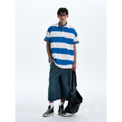 Original American retro striped short sleeved T-shirt for men and women, loose and casual vintage collar top, trendy